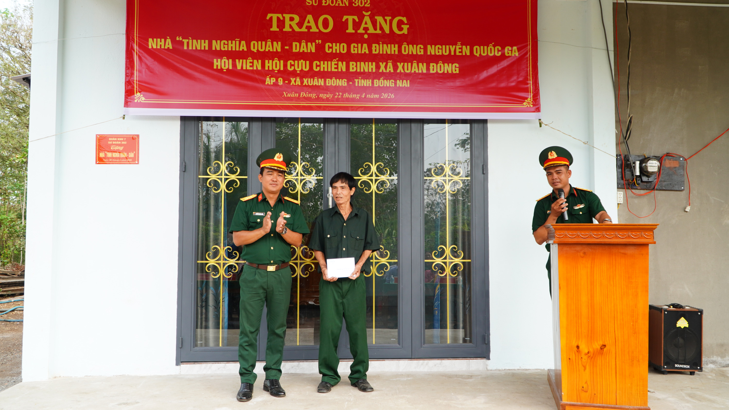 Sáng ngày 22/4/2026, Sư đoàn 302, Quân Khu 7 phối hợp cùng Đảng ủy - HĐND - UBND - UBMTTQ Việt Nam xã Xuân Đông và Ban nhân dân ấp 9 tổ chức lễ trao tặng nhà tình nghĩa Quân - Dân cho gia đình ông Nguyễn Quốc Ga là hội viên Cựu Chiến binh xã Xuân Đông có hoàn cảnh khó khăn về nhà ở.