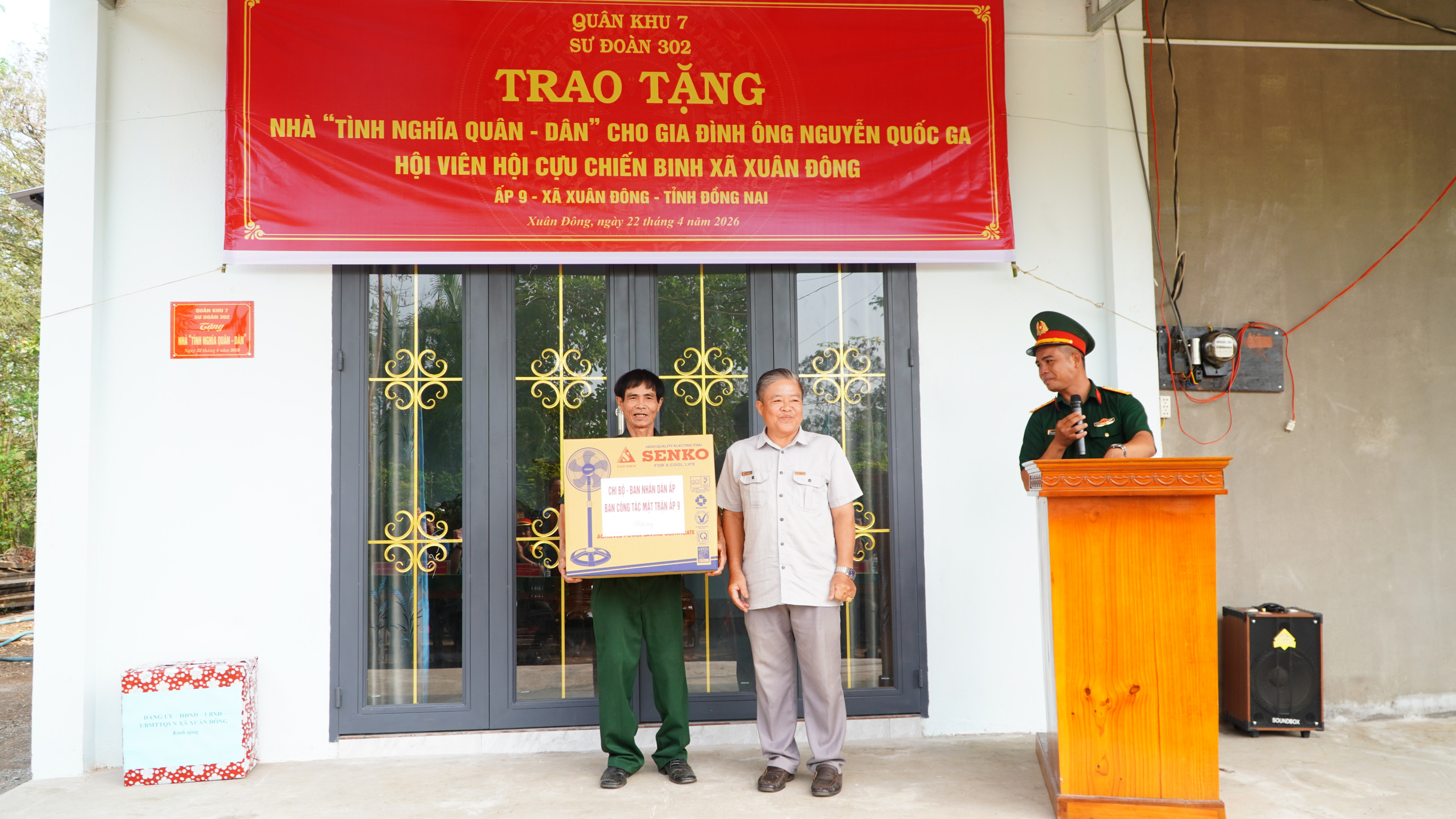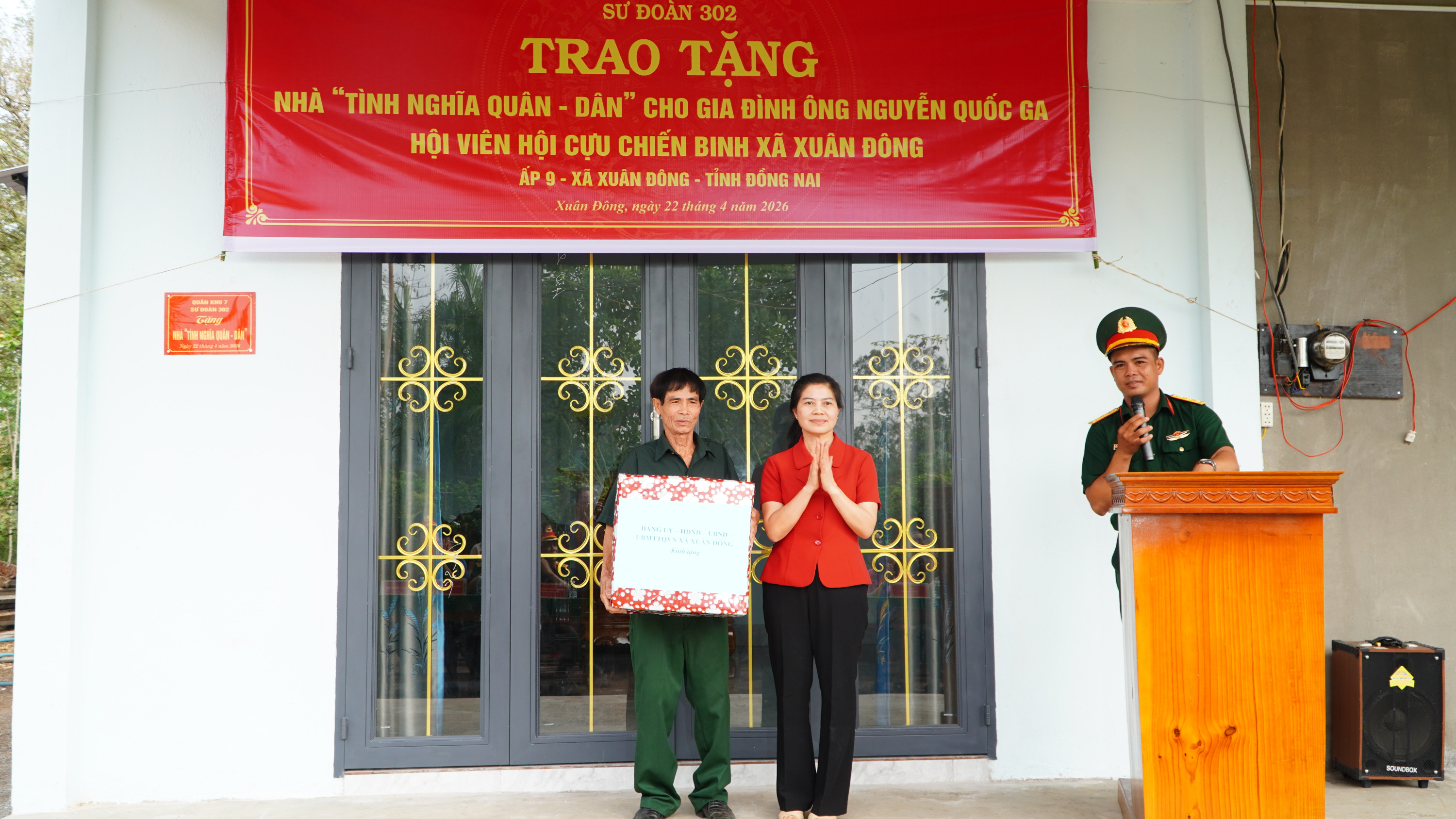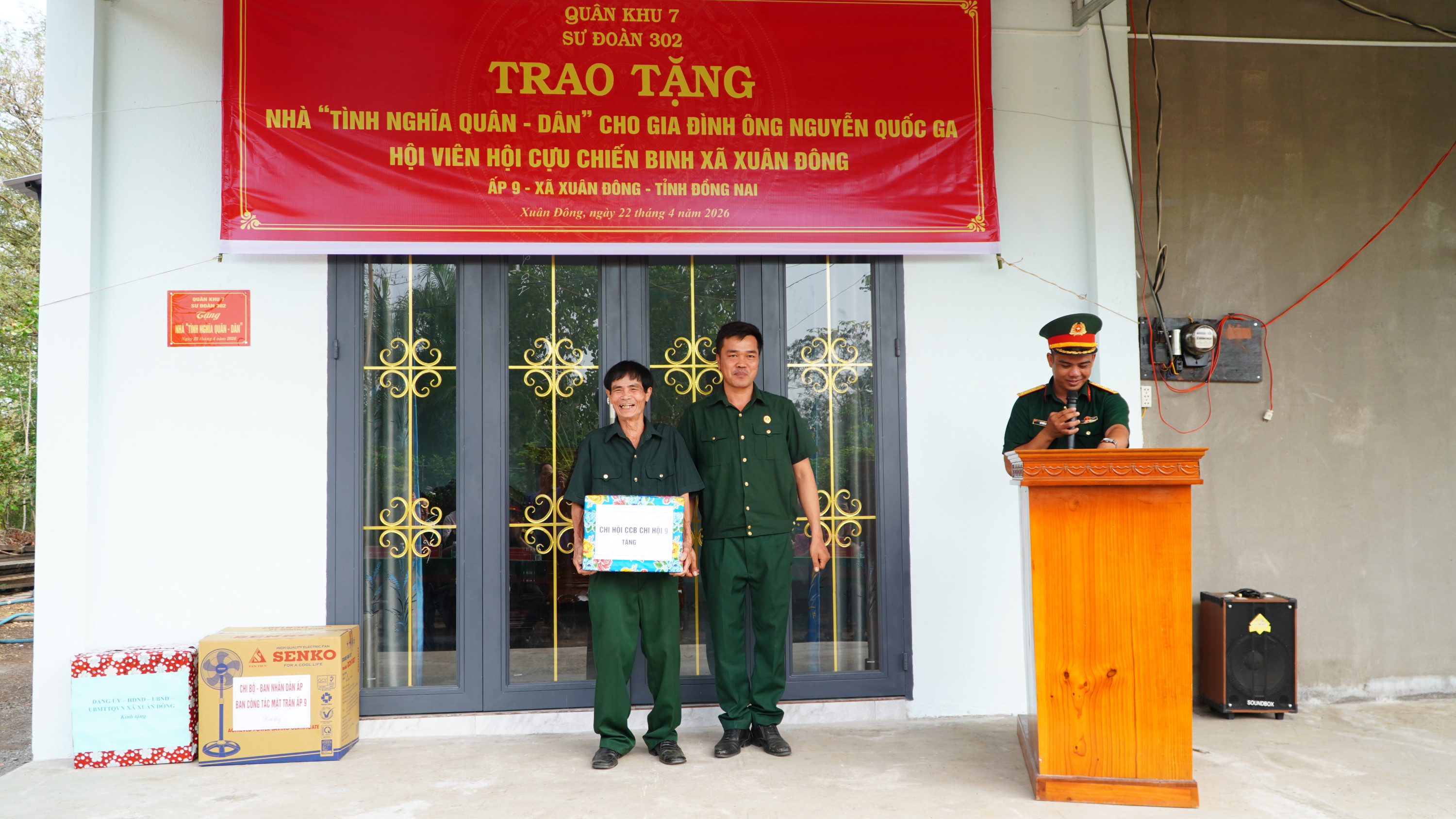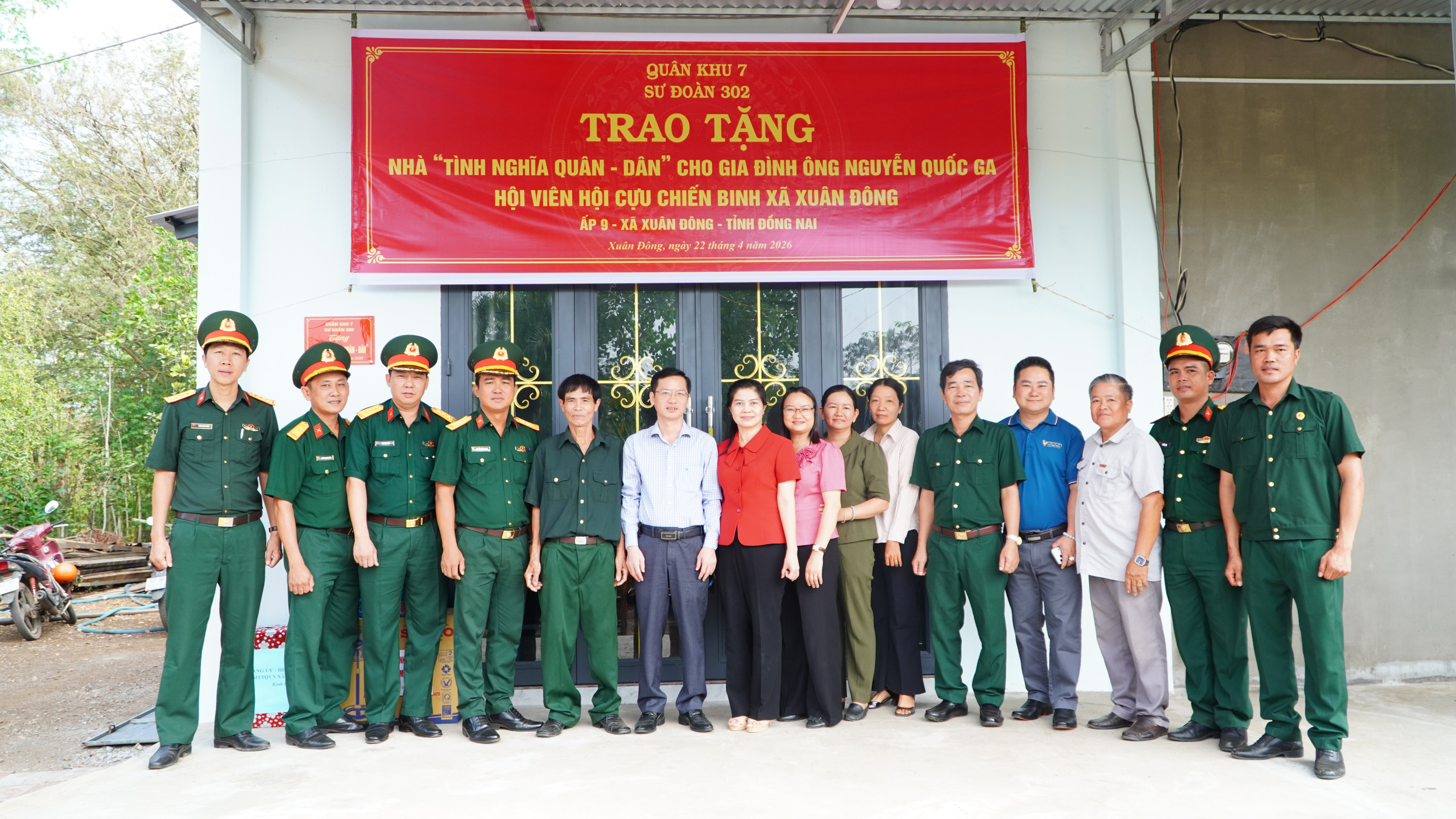 <figure class="image"><img style="aspect-ratio:3000/1688;" src="https://xuandong.dongnai.gov.vn/uploads/xuandong/news/2026_04/trao-nha_1.jpg" width="3000" height="1688" /></figure><p style="text-align:justify;text-indent:36.0pt;"><span lang="EN-US">Sáng ngày 22/4/2026, Sư đoàn 302, Quân Khu 7 phối hợp cùng Đảng ủy - HĐND - UBND - UBMTTQ Việt Nam xã Xuân Đông và Ban nhân dân ấp 9 tổ chức lễ trao tặng nhà tình nghĩa Quân - Dân cho gia đình ông Nguyễn Quốc Ga là hội viên Cựu Chiến binh xã Xuân Đông có hoàn cảnh khó khăn về nhà ở.</span></p><p style="text-align:justify;text-indent:36.0pt;">&nbsp;</p><figure class="image"><img style="aspect-ratio:3000/1688;" src="https://xuandong.dongnai.gov.vn/uploads/xuandong/news/2026_04/trao-nha-1_1.jpg" width="3000" height="1688" /></figure><p style="text-align:justify;text-indent:36.0pt;"><span lang="EN-US">Dự lễ trao nhà về phía Sư đoàn 302 có thượng tá Nguyễn Hoàng Phúc - Phó Sư đoàn trưởng Sư đoàn 302, Quân khu 7; Các đồng chí thuộc phòng Tham mưu, phòng Hậu cần - Kỹ thuật Sư đoàn 302. Về phía xã Xuân Đông có đồng chí Phạm Thành Hiếu - Phó Bí thư Thường trực Đảng ủy xã; Đồng chí Bùi Thị Vinh - Ủy viên Ban Thường vụ Đảng ủy, Phó Chủ tịch UBND xã; Đồng chí Thiều Thị Hoa - Đảng ủy Viên, Phó chủ tịch HĐND xã; Đồng chí Trương Minh Tuấn - Phó Chủ tịch Ủy ban MTTQ Việt Nam xã; Cán bộ, ban nhân dân ấp 9.</span></p><figure class="image"><img style="aspect-ratio:3000/1688;" src="https://xuandong.dongnai.gov.vn/uploads/xuandong/news/2026_04/trao-nha-2_1.jpg" width="3000" height="1688" /></figure><p style="text-align:justify;text-indent:36.0pt;"><span lang="EN-US">Căn nhà được trao tặng có diện tích 60m2. Tổng kinh phí xây dựng 140 triệu đồng, trong đó cán bộ, chiến sĩ Sư đoàn 302, Quân khu 7 hỗ trợ 100 triệu đồng, số tiền còn lại do các mạnh thường quân, người thân trong gia đình góp thêm xây dựng.</span></p><figure class="image"><img style="aspect-ratio:3000/1688;" src="https://xuandong.dongnai.gov.vn/uploads/xuandong/news/2026_04/trao-nha-4_1.jpg" width="3000" height="1688" /></figure><p style="text-align:justify;text-indent:36.0pt;"><span lang="EN-US">Phát biểu tại lễ trao nhà, đồng chí Phạm Thành Hiếu - Phó Bí thư Thường trực Đảng ủy xã bày tỏ sự cảm ơn sâu sắc đối với sự quan tâm của cấp ủy, cán bộ, chiến sĩ Sư đoàn 302 đã dành tình cảm đặc biệt cho địa phương. Đây là công trình có ý nghĩa quan trọng chào mừng thành công của cuộc bầu cử đại biểu Quốc hội khóa XVI và đại biểu HĐND các cấp, nhiệm kỳ 2026 - 2031; Chào mừng 51 năm Ngày giải phóng Miền Nam, thống nhất đất nước (30/4/1975 - 30/4/2026) và chào mừng tỉnh Đồng Nai trở thành thành phố trực thuộc Trung ương. Trong niềm vui có căn nhà mới, địa phương mong rằng hộ gia đình hội viên Cựu chiến binh Nguyễn Quốc Ga sẽ tiếp tục vượt qua khó khăn, vươn lên cải thiện cuộc sống.</span></p><figure class="image"><img style="aspect-ratio:3000/1688;" src="https://xuandong.dongnai.gov.vn/uploads/xuandong/news/2026_04/trao-nha-3_1.jpg" width="3000" height="1688" /></figure><p>&nbsp;</p><p style="text-align:justify;"><span lang="EN-US">Trước sự quan tâm của cán bộ, chiến sĩ Sư đoàn 302 cũng như của địa phương đối với gia đình, hội viên Cựu chiến binh Nguyễn Quốc Ga bày tỏ niềm vui, sự phấn khởi khi có căn nhà mới vững chắc để gia đình ổn định cuộc sống. Căn nhà góp phần tiếp thêm động lực để ông tiếp tục cố gắng vượt qua mọi khó khăn, phát huy tốt vai trò nêu gương của người lính “Bộ đội Cụ Hồ”, xứng đáng với sự quan tâm của của cán bộ, chiến sĩ Sư đoàn 302 và của chính quyền địa phương đối với gia đình.</span></p><figure class="image"><img style="aspect-ratio:3000/1688;" src="https://xuandong.dongnai.gov.vn/uploads/xuandong/news/2026_04/trao-nha-9_1.jpg" width="3000" height="1688" /></figure><p>&nbsp;</p><figure class="image"><img style="aspect-ratio:3000/1688;" src="https://xuandong.dongnai.gov.vn/uploads/xuandong/news/2026_04/trao-nha-5_1.jpg" width="3000" height="1688" /></figure><figure class="image"><img style="aspect-ratio:3000/1688;" src="https://xuandong.dongnai.gov.vn/uploads/xuandong/news/2026_04/image.jpeg" uploadprocessed="true" width="3000" height="1688" /></figure><figure class="image"><img style="aspect-ratio:3000/1688;" src="https://xuandong.dongnai.gov.vn/uploads/xuandong/news/2026_04/trao-nha-7_1.jpg" width="3000" height="1688" /></figure><figure class="image"><img style="aspect-ratio:3000/1688;" src="https://xuandong.dongnai.gov.vn/uploads/xuandong/news/2026_04/trao-nha-8_1.jpg" width="3000" height="1688" /></figure><p style="text-align:justify;text-indent:36.0pt;"><span lang="EN-US">Dịp này, Chỉ huy Sư đoàn 302, Đảng ủy - HĐND - UBND - UBMTTQVN xã, Ban Nhân dân ấp 9 đã tặng thêm cho gia đình các phần quà gồm tiền và các vật dụng thiết yếu, để gia đình có thêm niềm vui khi có căn nhà mới.</span></p><p style="text-align:right;"><span lang="EN-US">Thúy Hằng, Nhật Thanh</span></p><p style="text-align:justify;">&nbsp;</p><p>&nbsp;</p>