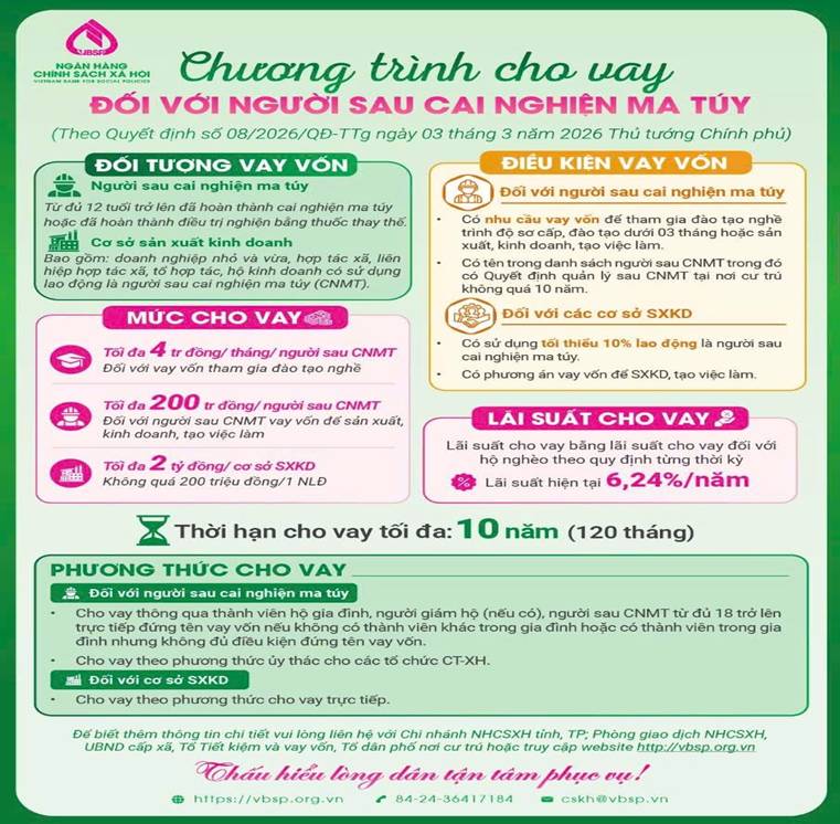 Ngày 03/3/2026 Chính phủ đã ban hành Quyết định số 08/2026/QĐ-TTg về chính sách tín dụng đối với người sau cai nghiện ma túy. Quyết định có hiệu lực thi hành từ ngày 1/5/2026.