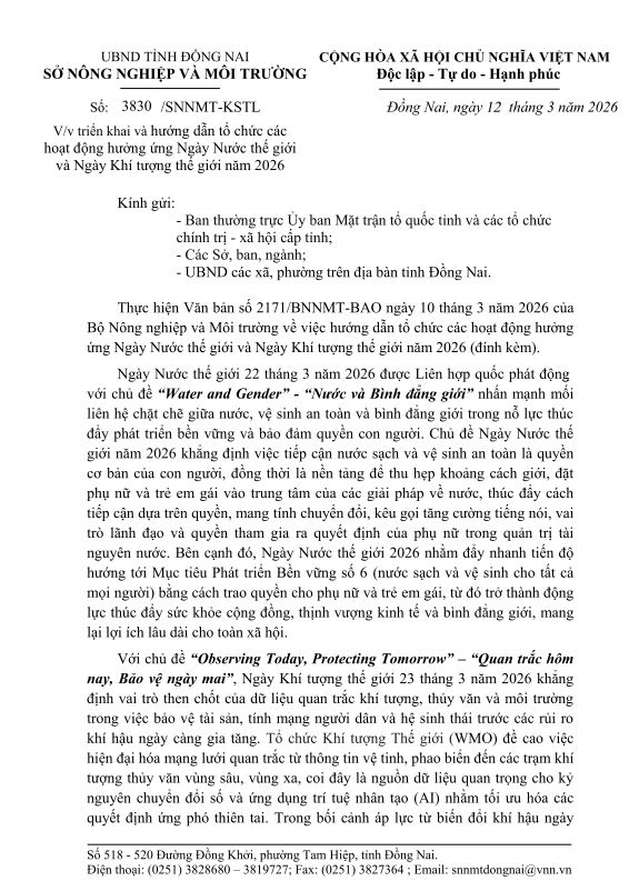 Thực hiện Công văn số 3830/SNNMT-KSTL ngày 12/3/2026 của Sở Nông nghiệp và Môi trường về việc triển khai và hướng dẫn tổ chức các hoạt động hưởng ứng Ngày Nước thế giới và Ngày Khí tượng thế giới năm 2026. Xã Xuân Đông đã khẩn trương xây dựng kế hoạch tuyên truyền hưởng ứng thực hiện Ngày Nước thế giới, Ngày khí tượng thế giới năm 2026.