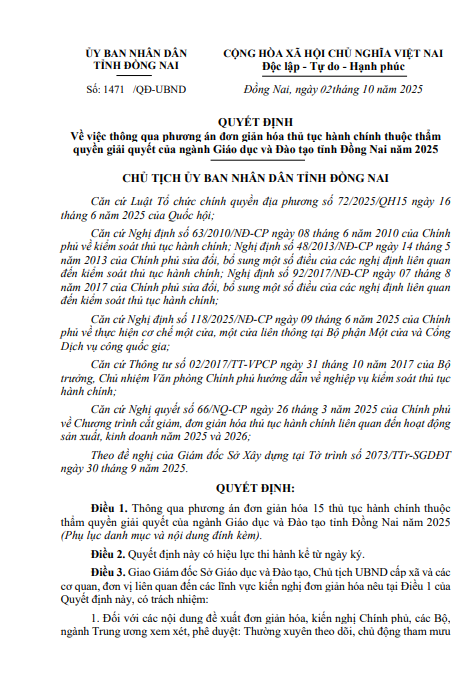 Quyết định về việc thông qua phương án đơn giản hóa thủ tục hành chính thuộc thẩm quyền giải quyết của ngành Giáo dục và Đào tạo tỉnh Đồng Nai năm 2025